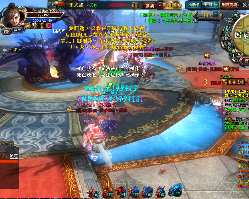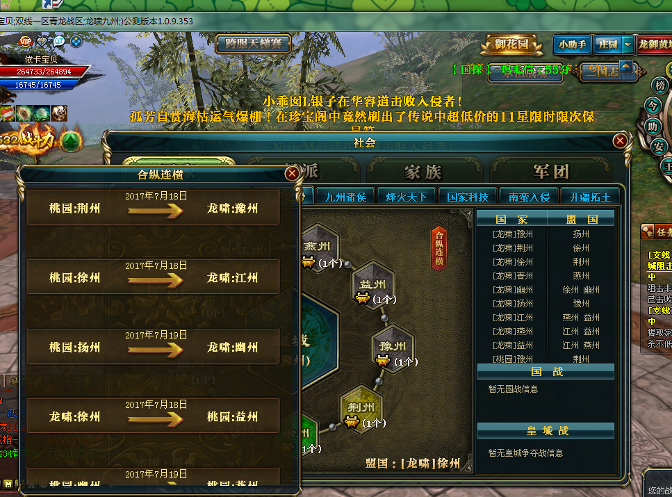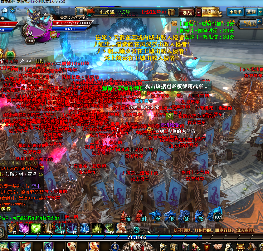 作者 香馨 自从双线一区开启互通服之后,让无数御龙老骨灰玩家添加了更多的激情战役,特别是遇见实力相当的对手,更让大型战役增加了无限的精彩。 2017年7月18日周二,【桃园风云】帝国荆州强势发起进攻【龙啸九州】帝国豫州国战开启,按御龙在天最悠久历史的两个服务器,也是目前最强大战斗力的两个国家,堪称是御龙的最顶端的两国之战,下面就让我们期待一场轰轰烈烈的激情大战吧。 作为进攻方的荆州非常强势,晚上8点才过就组织好大部队浩浩荡荡通过中立的互通使者传到【龙啸九州】中立,并黑压压的直压到豫州边境,来势汹汹,进攻步伐非常迅猛。然而今天的豫州出现反常现象,在国战正式开战时间了,QT上还是没有出现指挥官,虽然豫州战士们与盟国扬州兄弟也自发到阳平关镇关守将防守,可是群龙无首的状态多少影响了战斗,所以荆州非常轻松就击杀镇关,杀到豫州王城! 荆州进入豫州王城之后,马上就围拢金甲将军,一部分战士领取了国战弩车,一面击打金甲将军,一面开始对于豫州内城展开进攻。围观战场荆州参战人数和你明显是占据优势的,很快就击杀金甲将军之后,蜂拥而进来的内城朱雀玄武进行击杀,面对如此战况,防守的豫州与扬州战士,也纷纷投入了击杀红名战士之中,挣起大量武勋,因为没有指挥官,其实豫州战士基本上是放弃防守了,一切以个人国战成就为主,所以,荆州凭借人多势众很快就双爆朱雀玄武,飞奔到中间神兽奋力输出,神兽血量下降很速度,用势如破竹的神速收获了国战胜利。 其实在总体是实力上,豫州拥有十多套18星大神战斗力是非常强大的,可是今天备战不到位,导致没有一个非常规范的防守,最终导致国战被秒杀的悲剧,让无数期待精彩对战的铁血御龙战士很失望,希望在未来两国打出一个真正的高水平对战,让热血沸腾起来。 [编辑:叶子猪小秘书]