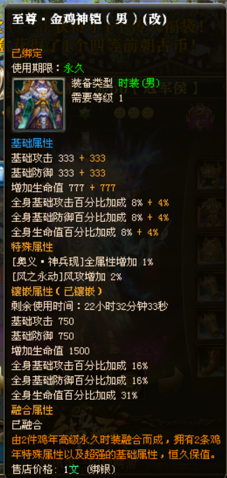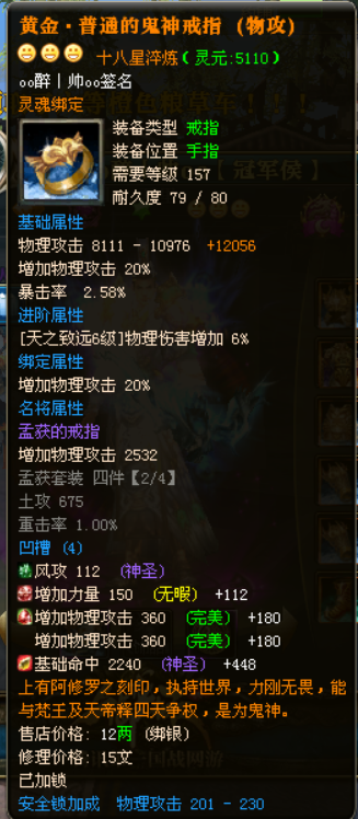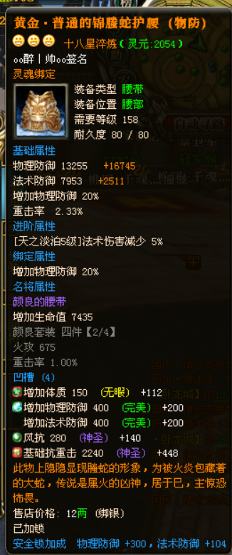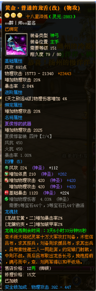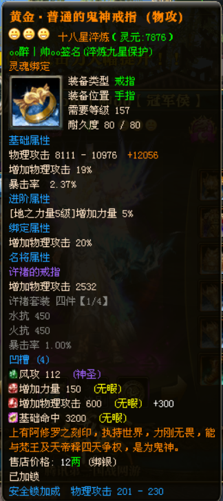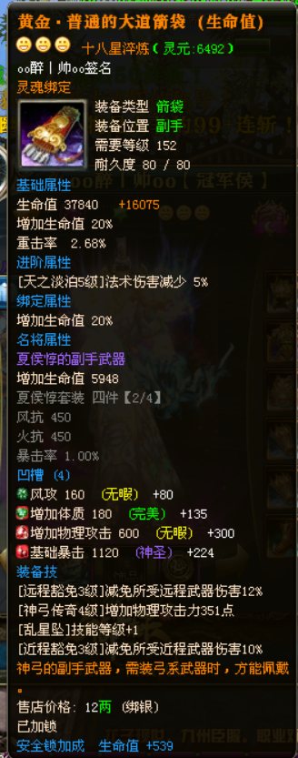 所谓乱世造英雄,古时在战乱时代往往涌现出许多英雄人物,而在御龙在天这款国战战争游戏中,混乱不堪的九州格局同样也造就了不少的御龙名人大神。而在局势变化莫测的桃园风云内,近日又出现了一颗新星,他就是幽州刚刚踏足十八星天尊的oo醉丨帅oo。 说起这位大神,桃园的幽州国民必然不会陌生,因为这位大神的砸星实在是太过于漫长,在2017年初的时候这位大神就已经开始陆陆续续动工砸十八了,当仅差一件装备的时候却突然弃之不管。就这样维持了将近半年时间,本来以为这位大神要做一个最强的十二星,但是这位大神却是突然极其迅速的将最后一件装备砸到了十八星,成为了桃园风云内屈指可数的大神之一,虽说此号刚砸成战力略低,但是如果号主有心加大投资的话,变身强力战神指日可待!! 角色名:oo醉丨帅oo 战力:12720628 装备简介:人物双金橙色十八星副将史诗紫十二星,传人精良十星马庄橙色十一星,五六等宝石混搭以及白色改造宝石孔,紫色八卦四级12件套,加强紫十三星披风 [编辑:叶子猪小秘书]