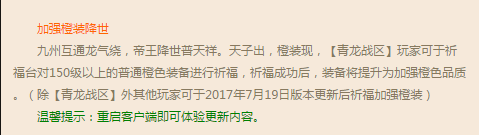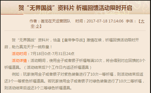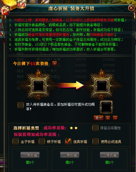 祈福活动,一直都是御龙玩家乐此不疲的活动。因为虽然祈福需要银子和金子,但是自从出了祈福道具以后,就可以免费祈福,提升装备,是对平民玩家的一大好处。 而这一次的祈福活动,一共出了两项。第一项是在祈福活动限时开启后,每使用10次金子或者银子进行祈福,就会得到对应回馈的3个祈福道具。在活动七日后返还。这也就是说,如果一个玩家使用金子对紫色玩家进行10次一等祈福,那么活动结束以后,就会返还3个一等祈福道具。如果是对绿装祈福就会返还绿色装备!当然你用三等祈福也就是会返还三等祈福装备。如果是混合祈福,应该就是按最低的算了! 而第二项活动就是加强橙装出来了,要祈福的人就可进行通过这一次祈福十次的活动获得返还祈福的机会了!这时候不管高战还是平民都可以参加这个活动,因为即使没有祈福道具返还,他们还是会祈福的!绝对超值,大家来参加吧! [编辑:叶子猪小秘书]