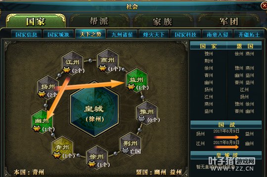 【英雄美人】帝国江州开服至今一直很强势,国力一家独大,战斗作风也非常强悍,与幽州和青州一直交战。按国力强弱来看,这个服务器形成了一个帝国八个弱国的模式,而益州、幽州、青州也可以结为三国盟国,这意味着今天晚上的国战是五个国家的混战。并且随着官方最新的大型活动国战大咖秀开始,国战的面貌将会改变很多,比如国战失败方的官员在第二天不可以领取国家俸禄,国运的镖局也会出现不同比例的赔偿,这样的战斗方式无疑让国战竞争更为激烈。