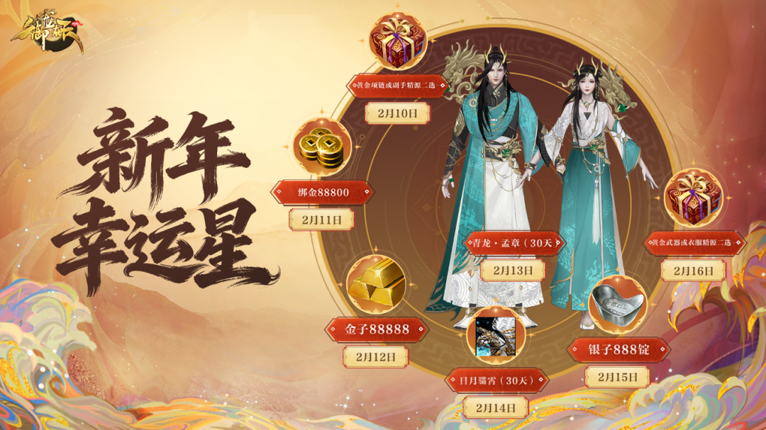 尊敬的御龙将军: 为了感谢将军们对《御龙在天》的热情参与和支持,同时为了给大家带来更好的游戏体验,我们将于2026年2月10日对全区全服进行更新维护!为此给您带来的不便,我们致以最诚挚的歉意!维护期间欢迎您进入《御龙在天》官方wegame社区与更多玩家讨论更新内容以及相关精彩活动。 维护时间:2月10日8:00-10:30 维护范围:全区全服 最新客户端版本号为:1.0.9.925 【版本更新后,截至本周日,40级以上将军可在王城(626,563)“暖心小双”处领3000绑金+5锭绑银+上班族减负7天的版本更新福利。 一马当先 御战新年 马年海量福利燃情开启 金戈铁马辞旧岁,漫卷王旗贺新春;九州同奏凯旋曲,四海共饮庆功樽。 版本更新后,马年新春系列福利活动盛大开启,诚邀诸位将军新年同庆佳节,畅享丰厚金银、黄金混沌精源碎片、橙色宠物、精美时装坐骑等春节豪礼!同时,新年期间无硝烟、跨天累积提升等多项任务减负措施也将全面开启,祝愿全体御龙将军开开心心庆团圆,欢欢喜喜过大年! 【活动内容】 1、小双陪你过年 领完美宝石、华为手机 活动时间:2月16日~2月24日 新年新气象,小双伴身旁;每日开福袋,惊喜滚滚来!春节期间,每日可通过活动页面或微信公众号活动入口,开启当日福袋(错过可补领当日前四天福袋~)点击领取福袋可将奖励存入新年福箱中,内含完美淬炼宝石、四等智慧星辰双属性宝石合成符、红昭灵兽坐骑、春风盈门时装等好礼,分享活动将有机会抽取华为Mate70 手机、无线耳机等豪华奖励。将军可自行于新年福箱中领取至游戏内,福箱奖励最终领取时间截至3月23日。 2、开年利是 领橙灵珠、混沌精源豪礼 九州万象更新,新春鸿运当头;2月24日-3月9日,将军可在王城“ 新春女神”处免费领取开年利是,开启可获得:混沌防御精源、橙品灵珠精源、马上来财紫称号15天、橙色鸡毛令箭、高等淬炼宝石、齐天大圣变身卡等丰厚好礼(不同版本奖励有差异),祝愿将军们新的一年所求皆如愿,所行皆坦途,新岁宏图大展,霸业再攀高峰! 3、春节上线赢黄金武器、88888金子 谁是新年幸运星?谁能收获最高奖励?2月10日至2月16日,每天22:30开奖前登录游戏可获得抽奖机会1次,抽到的内圈奖励*外圈倍数即为实际获得的最终奖励,参与了幸运转盘的将军,有机会成为当日的全服幸运星,活动期间22:30开奖,每天10位幸运儿将会获得黄金武器、88888金子、飞马、神兽时装等稀有大奖! 4、新年淬18星赢18星 新年淬星大赛正式开启,全民零门槛免费领取海量淬星石,挑战爽快又刺激的砸星比赛;究竟哪位将军技高一筹圆梦18星,成为御龙最强淬星大师,赢取华为平板、18星/15星卷轴等超豪华大奖,让我们拭目以待! 2月24日-3月9日,将军每日上线即可获得淬星币,更有结义兄弟每日相助获得更多淬星币,购买专属淬星道具淬炼神龙装备。星级越高、消耗越少、达成速度越快,将在排行榜上获得越高名次,赢取华为平板、耳机、京东卡、18星或15星强化卷轴、黄金飞马、十三周年·淬星大师永久称号等至尊大奖;本期新增全服结义淬星排行榜,与结义兄弟一起互助淬星,挑战全服新年结义兄弟最强欧气排名和奖励!! 5、新年挑战大圣 赢红包福币、变身卡 新年九州狂欢,花果山美猴王携海量豪礼降临御龙大陆!此次大圣以分身之术现身各国边境,邀各位将军切磋竞技,幸运的将军将获得大圣带来的筋斗云、大圣变身卡、庆新头像(7 天)、银子、淬炼宝石等贺礼! 刷新时间:每周一、二、四 13:00、21:50 各国边境将同步刷新 BOSS 齐天大圣。 6、春节领千亿经验犒赏 新年升级最轻松,截止3月16日23:59,将军们可在活动界面领取丰厚的经验礼包,活动期间,将军们完成任务获得经验的同时,会额外从本活动中获得丰厚的经验加成回馈,每日最多提取总经验的10%。 7、比翼双飞 情侣争霸赛开启 只愿君心似我心,定不负相思意。御龙13年的时间,成就了太多浪漫的情侣。他(她)们有江夏之约,有芒砀山誓言,更有一句:“御龙不倒,我陪你到老!”的真情承诺。比翼双飞,情侣争霸赛隆重来袭! 活动时间:2月10日-3月12日 赛事分组: 第一组:【龙啸风云】【龙舞九州】【逐鹿天下】【龙腾问鼎】 第二组:【龙战王者】【群龙纵横】【九州龙虎】【龙耀狂飙】 第三组:【凌云巅峰】【惊世龙舞】【九州争锋】【金蛇揽月】 第四组:【潜龙九霄】【御战霸业】【龙腾烽火】【威震天下】【义聚九州】 第五组:【龙吟苍穹】【飞龙在天】【帝御山河】【傲世皇朝】【盛世太平】 报名条件:两个本国异性角色在附近进行组队,即可通过界面上方悬浮按钮【情侣赛争霸赛】界面进行活动报名。 海选规则:海选期间将军可通过给参赛队伍任意一人送花,即可增加对应参赛队伍积分。送花用于海选投票,海选结束时,本服积分排名前30名队伍将成功入围跨服赛。赛事共分为六个阶段,具体赛事介绍可查看官网资料站-跨服情侣争霸赛 本次跨服情侣争霸赛部分专属外观奖励:【具体各排名奖励可前往游戏内查看“奖励预览”】 8、马跃新春 倾国红颜大赛开启 红颜知己,情深意长,御龙大陆红颜传奇灿若明星,她们兼具美丽与才华,更有豪情和勇气,在这浪漫的情人节期间,倾国红颜人气大赛隆重开启! 活动期间,40级以上女性角色玩家可以报名参赛(男性角色可进行投票),活动入口:福利中心→倾国红颜大赛(或者右侧边栏爱心图标)。截止3月8日,根据参赛者所