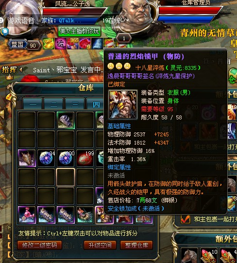 风流灬公子逸,九天揽月豫州成员 在90封印时很是低调一身的12X就在一个平常的夜晚风流灬公子逸 突然传出消息要砸18X 随后便在YY开启直播 经过小编的采访 风流灬公子逸 光在砸星方面便投入50W元RMB 但目前只是砸出了8件18X 后续的小编会继续跟踪报道 其余三件目前正在努力中 小编只想说土豪求抱大腿啊
