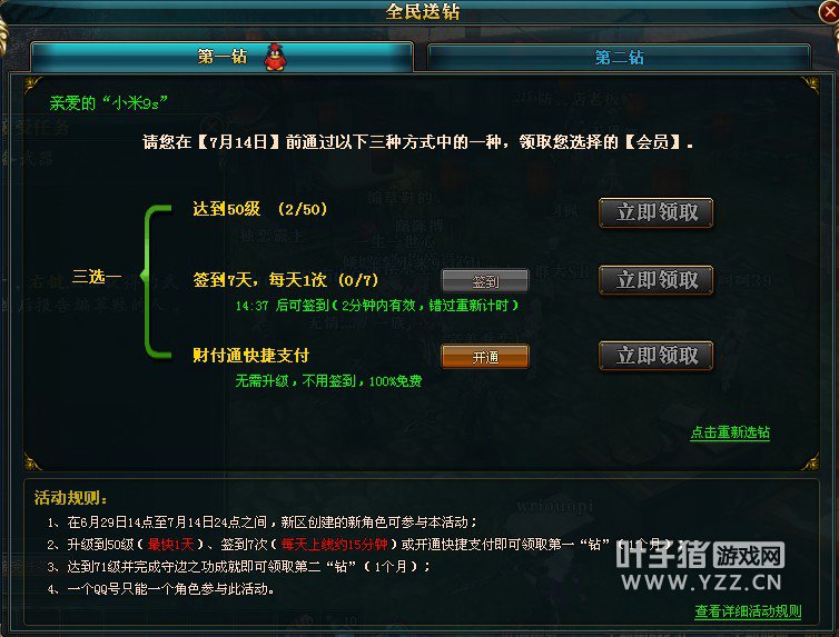 领取一个钻可选择三种方式,升到50级,或者签到7天,每天在线15分钟,或者开通财付通快捷支付一次性领取