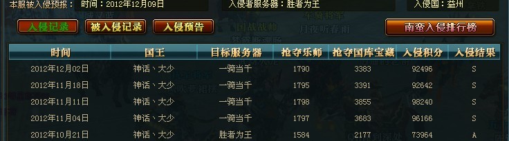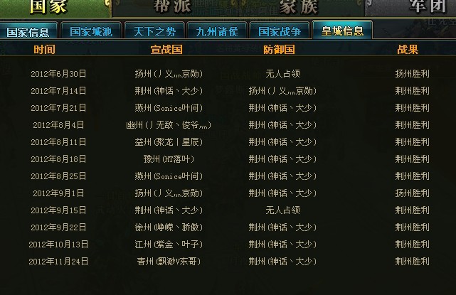 三国志快到了!我们霸者无双荆州铁骑将踏平三国志大陆!今天我们大少说了 除了桃园的扬州北狼是个对手 !其他服务器将无视!(其他服务器的来喷吧)! 霸者无双荆州的实力相信大家都已经略知一二 国砸1国V8国 皇城战1国V8国 国战经常是1V2( 双赢) 1V1不敢反击!南蛮次次9W分+!国战胜利胜利85场 失败17场 敢问全区有这样的战绩吗? 我们神话丶大少就是整个御龙的神级指挥! 没图我说个JB