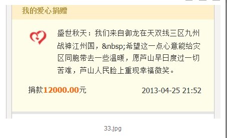 还记得有一次,上班回家晚了,这个时候按照平时开镖局的时候,我们的镖局已经关了。几天木有拉车的偶没赶上投保的时间,享受不到经验加成的我,为了经验这次无论如何也要硬着头皮拉车,心想砸就砸呗!为了我那点指日可待快要升级的经验,我豁出去了。车快到阳平关的时候,被几个外来妹围攻,虽然打了五级强力。可是也不行啊!人家可是紫9,我这个绿7怎么是他们的对手,说时迟那时快,不过说真的,这国频还真有好处,在国频上一呼动全身,我们的国王马上就出现在我的面前。在写着稿子的时候我还在纳闷!国王到底怎么出现在我面前的,瞬移符,不是;召唤符,不是一个家族的;遁地符,更不是;绞尽脑袋也不知道,原来我们国王是开着他那兰博基尼来的,那这就别去毋庸置疑他那速度了。国王那速度可比那瞬移符还管用,完全是瞬秒了那几个砸车的,他们就真正的做了灰太狼飞回自己的国家了。不过要说搞笑呢?要属听国王指挥,国王不常上麦,但是每次上麦的时候,他那一口不太标准的普通话让你听了总是心旷神怡的。特别是国家出镖车的时候,兄弟们啊!你们一定要打上强力,被砸了的兄弟镖师灰一下,一定要灰勤一点,这样我们兄弟的车才不会被砸。听着这里我们懵了,我在想啊!如果当时听着这话我在吃饭的话或是喝水的话,一定连喷带打直接噗嗤出来。什么叫飞禽,,,还走兽呢? 不过最让我们感动的就是这次国王以整个江州兄弟的名义给灾区捐款的事,国王说:“为兄弟们护上最后一趟车”。就去为灾区献上我们的心意,因为我们是兄弟,我们留着同样的血,一方有难八方支援,这是一个不争的事实。因为国王的这话,让很多的江州兄弟都为国王竖起了大拇指。我们应该为可爱的国王而骄傲!为生在江州而自豪!有国王一天,我们挺你到底。