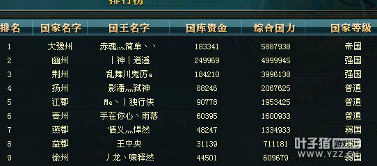 恭喜王者风云帝国帝国豫州成为本区第8个没鼎的国家,帝国1年半,国王简单退服1星期,为了和荆州对抗讨好幽州3个18套,大鼎就送了,从此 豫州什么丢人现眼事都干了,就差送老婆了。一个游戏玩成这样,我只能说佩服! 以后什么都无所谓,豫州已经没有任何资格在叫嚣了 。耗着呗。口水、讽刺对这帮人都没意义了。一点血性没有。一点游戏精神没有 呵呵! [编辑:小闲]