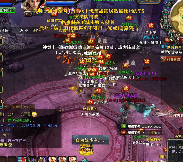 众所周知帝陵战役其实跟王城战役是一样的性质,是最能体现国家、帮派的实力的战斗,也是最为激情的战役。面对老服务器,已经很少有会出现此种大规模战役。2014年6月7日,下午6点30分,老区霸者腾飞强国徐州跟帝国幽州帝陵12层战役,拉开序幕。 霸者腾飞局势: 随着之前六国盟的瓦解,新的联盟成立分别为:徐州(强国)益州(弱国)VS 幽州(帝国)青州(强国)豫州(普通)江州(普通)。幽州联合之前的死敌,青州及大象形成四国联盟,对徐州展开国砸,一直扬言要砸死徐州,奈何徐州执行力超高,四国下边收益很小。反而徐州凭借高战力及高执行力的优势,无限反砸四国(主砸幽州江州)。直到现在,幽州最多每天只开2个小时镖局,江州每天只开不到1小时,徐州镖局照常24小时营业。 霸者腾飞帝陵战: 随着矛盾不断升级,不满于现状的徐州,势必要把幽州帝陵拿下。宣了三次,第一次被青州卡了招财猫,没能打;第二次:幽州找小帮派卡了帝陵;第三次终于被徐州宣上。 当天下午,徐州高管做好了充分的准备及措施,为帝陵战创造了有力条件。 指挥战役是在YY进行,2014年6月7日下午18:30分,随着指挥大喊进入帝陵战役,徐州铁骑已迅雷不及掩耳之势冲向中间BOSS,左右两边 BOSS同样派遣给力家族前往,不久便拿下四点BOSS,激潮澎湃的战斗,令每个徐州玩家热血沸腾,气势瞬间压到对方。中间BOSS都是秒爆的节奏,比分瞬间拉大。整场战役耗时25分钟,结束比分10W(徐):5W(幽州)。最终总以帝国为傲的幽州就此战败。。 幽州指挥扬言说,下周要打回去;可是面对这么悬殊的实力跟比分,结局会是怎样,敬请期待。。。。 [编辑:若爱]