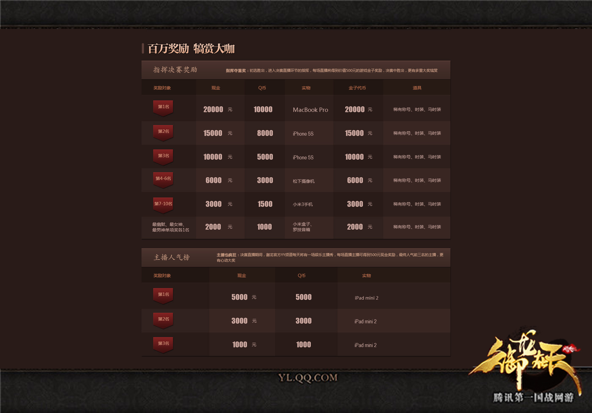 腾讯第一国战网游《御龙在天》自上线以来,就以其卓越的游戏品质受到了广大玩家的热力支持。作为一款以国战为主要玩法的网络游戏,《御龙在天》一直不断推出多种创新国战模式,给所有热爱大型国战的玩家们带来了前所未有的激情体验。在御龙九州争霸的世界中,国战指挥必不可少,指挥一声令下,千万御龙铁骑征战沙场。在国战网游日益火爆的当下,国战指挥也越来越趋于职业化,大量玩家开始追求自己的指挥梦。此次,《御龙在天》给所有国战指挥打造了一个梦想的舞台,“国战大咖秀”活动八月火爆登场。公开公平公正的赛事体制,娱乐与激情结合的赛事流程,势必掀起一轮“国战指挥热”。 活动地址:http://yl.qq.com/act/a20140805cast/ 指挥大咖秀圆指挥梦 在任何一款国战网游中,国战指挥都扮演着非常重要的角色,关系到一场国家对决的胜负。一名优秀的指挥不仅需要在战前了解敌我实力、分析国战走势、布置战略战术,还要在国战时积极鼓舞国民士气、组织国民统一行动、保障国家实力的稳定发挥,可以说在某种程度上国战指挥是一个国家的灵魂人物。 随着玩家越来越重视指挥这一角色,国战指挥逐渐趋于职业化,《御龙在天》也借此时机推出首届国战指挥选拔赛——“国战大咖秀”,给国战指挥提供了一个展示舞台。报名期间,所有御龙玩家均可通过官方主赛场参与报名,同时初赛还开通了YY分赛场和媒体分赛场两大报名渠道,参赛者可以通过国战视频或录音展示自己的指挥才能。另外,决赛期间,玩家还将接受现场指挥任务的挑战,并最终角逐出十大王牌指挥官,入驻王者圣殿,受万千玩家的敬仰。一场指挥大咖秀即将上演,王者盛宴再度升级。 指挥未来趋于职业化 近几年来,随着电子竞技比赛在国内市场日益完善化,专于游戏的职业工会也层出不穷,各种职业玩家如雨后春笋般快速成长起来。国战指挥作为国战网游中不可或缺的角色之一,也逐渐成为网游界的新兴职业,获得越来越多玩家的广泛关注。国战指挥在游戏中不仅扮演着指挥官的角色,更是逐渐成为国家权威与实力的象征,各大网游公会纷纷培养专属国战指挥,借由指挥影响力树立良好的公会形象。 在这样的时代背景下,不断推出创新国战玩法的《御龙在天》在激起玩家国战激情的同时,也推动了国战指挥的职业发展,越来越多的玩家开始向往成为一名国战指挥,在《御龙在天》未来的发展道路中,指挥职业化将成为一种趋势。一个具有丰富国战经验和强劲指挥能力的国战指挥,势必受到玩家们尊敬与膜拜。此次《御龙在天》国战指挥选拔赛,不仅为玩家提供了一个圆梦的舞台,更是将国战指挥推到了媒体的荧光幕下,相信名利双收的诱惑下,国战指挥职业化必将迅速发展起来。 国战加入电子竞技赛 纵观近年来国内网游市场,不难发现国内MMORPG市场发展并不乐观,但独具中国特色以历史为背景的国战网游却一直深受广大玩家的喜爱。以三国为历史背景的腾讯第一国战网游《御龙在天》就是众多国战网游的佼佼者,自公测以来,《御龙在天》就以其恢弘磅礴的游戏场景、丰富多彩的国战元素、独具匠心的新颖国战模式广受业内外人士好评,掀起了国战网游的大热潮。同时,《御龙在天》作为腾讯首款QTE泛国战网游,在腾讯的资源平台下,拥有大量的玩家群体,具有丰富的市场资源,潜在用户群体也不容小觑。 此次CJ现场,《御龙在天》为玩家献上了一场精彩绝伦的楼兰之争,展现了激情四射的国战魅力。未来的发展中,《御龙在天》国战赛事将逐渐加入腾讯游戏推出的电子竞技大奖赛,助力腾讯游戏竞技平台向全方位扩展,给玩家们带来丰富多彩的电子竞技赛事体验。国战也将一步步成为电子竞技赛事的一部分,致力于成为一个国际化游戏的标杆。届时,国战指挥将更为炙手可热,国战指挥职业化势在必行。 腾讯第一国战网游《御龙在天》推出王牌指挥选拔赛——“国战大咖秀”,新颖活动指引国战网游新风向,为广大玩家打造圆梦的舞台的同时,推动国战指挥的职业化发展。 关于腾讯游戏 腾讯游戏,全球领先的游戏开发和运营机构,国内最大的网络游戏社区。以“用心创造快乐”的理念,腾讯游戏通过在多个产品细分领域的耕耘以及对四大平台的打造,致力为玩家提供“值得信赖的”、“快乐的”和“专业的”互动娱乐体验。 腾讯游戏,用心创造快乐! [编辑:若爱]