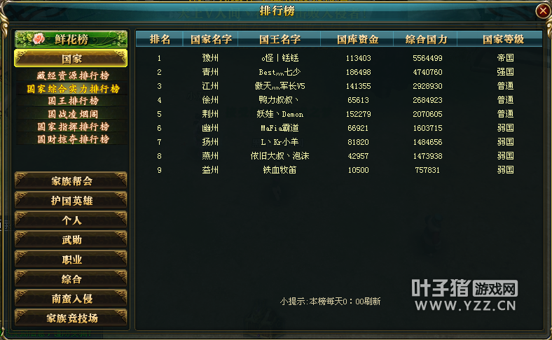 推荐阅读: 一:服务器:神龙一统 12月26日突破140级封印(由于有破封之力原因,封印原因随时变化,以下不做重复) 1,帝国依然是幽州,国王低调得小哥由于现实原因,一直没有玩游戏,国家由公会在管理,三国志盟友罗小贝退服之后,对幽州而言更是雪上加霜。本服面对豫州和燕州的联合打击,拉车托运都已经变得十分困难,在放弃三国志之后,国内民心已乱,国力最近面临下降的危险。 2,国王呦开心,史诗15,未来有可能成为新的18X大神。豫州迎来了【神秘团体】家族,更加如虎添翼,高战优势明显,目前大力收人中,国内继续加大对幽州和益州的打击力度。迎来了新的指挥战传说,给国民新的变化。如果三国志开启之后能给力,帝国将不是梦想。 3,益州,与幽州为盟国。国王美美美飞扬同样不是本人在玩,在幽州十分被动的情况下,益州的情况也十分糟糕,由于罗小贝退服的影响,合区也是遥遥无期,国力也将不可避免。 4,燕州,与豫州为盟国。国王天之丶雨哥挺过了最艰难的时期,由于长时间的被动,国家执行力为九国最高,目前在大力收人,但是由于本服很多人对燕州的感觉不是很好,收人效果不是很明显,但是想要崛起,在目前的局势下不是难事。 5,其他国家没有较强的战斗力,基本上都是由一个家族独占。 二,服务器:开拓千军 12月16日突破140级封印 1,益州。三国志魏王,18X大神罗小贝宣布退服,并已下王。罗小贝下王,不仅是对本服的影响,影响以扩散到整个九区。九区土豪屈指可数,罗小贝,低调得小哥,神霸主,公子奇,战若风,弑魂无情,郝凌雪等均已先后退服,九区已经成为名副其实的屌丝区,三国志更是没有强力势力,你让TM怎么坑,三国志迟迟不开,因为TM想赚钱啊。在罗小贝退服之后,益州能否挺住徐州的压力,谁又能接手罗小贝的益州王,让时间等待见证。(据说罗小贝宣布下王的时候在YY里哭了,是一个重情义的人) 2,徐州。国王冲锋陷阵一直以来是益州的死对头,罗小贝的下王对于徐州而言是天大的喜事,可以举国欢庆了。但是有没有人知道冲锋陷阵又会不会想念罗小贝呢。 3,其他国家一直抱笼在益州的徐州的身边,此次益州下王,势力会有人跳出来,拭目以待吧。 三:服务器:群雄争先 2月21日突破140级封印 1,豫州。国王丢丢。丢丢接手了豫州,虽然国力下降,高战减少,但是一起经历风雨走来的豫州兄弟仍然坚守着。在与青州的帝陵争夺战,成功守护住了帝陵十二层,极大的鼓舞了国民士气。战斗民族的底蕴可见一般。 (据说公子奇大婚完毕,近期回归,不知是真是假) 2,青州。国王七少。豫州最大的敌人,国内迎来了霸气家族,已5000分的微弱劣势输掉了帝陵战,青州还会继续发起对帝陵的攻占,葫芦娃真心强大。 3,江州。与青州为盟国,军长史诗15。 4,徐州。豫州的盟友,由于是整合的国家,还需要时间继续磨练,执行力在稳步的提升中。 四:服务器:天空福将 12月18日突130级封印 1,扬州。合区之后战若风便退服了,国王现在是战弥漫。由于战若风的强大实力,导致本服成为死区,又与更加死区的天空海阔合区,使战若风失去了投资的想法,三国志大陆的迟迟不确定,会不会让又一批大手接连退服呢。虽然高战不多,但是人口基数大,执行力高。 2,徐州。国王天少,天空海阔皇帝,为应对合区,将国民有江州转到了徐州。 3,豫州。国王楚霸王,传闻此人重情重义,与荆州为盟国,共同打击扬州。两国高战众多,优势明显。 4,荆州。国王缔造翔龙,与豫州为盟国,又一次九区的2V2局面。 五:服务器:猛龙在天 12月15日突破130级封印 1,豫州。国王鹏少。国内战斗力极强。 2,幽州。国王寻欢,此人指挥充满激情,深的民心,也是一个土豪,为报的美人归,与感恩节为心爱之人飘花。目前与荆州开战,并大胜荆州。又在帝陵12层的争夺中胜出。 3,荆州。国王强力15X,大都督神逍遥。目前人员流失严重,但是大都督的威信依然还在,女王只是打酱油的。目前国家较为混乱。 注:冥王有晴每帖一个小帮助。新出的国战战魂道具,时间短的道具与时间长的道具进行合并,以时间长的为准,在也不用担心没有国战,道具过期了。 [编辑:懿米粉]