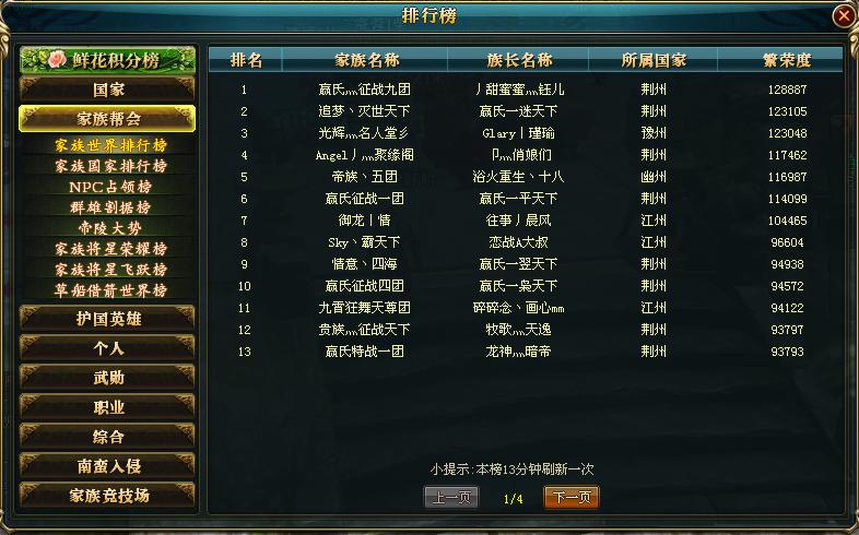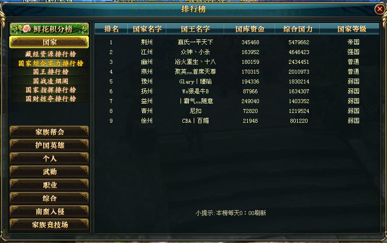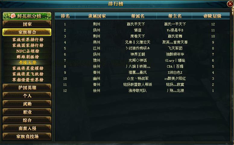 推荐阅读: 【战龙狂舞】曾经激情澎湃的一个服务器,随着时间的流逝,大神还是内些大神,依旧是荆州、江州独大的局面,不过现在的这个服务器少了一些碰撞的时刻,趋于稳定了,江州、荆州互相牵制,谁也不能击垮对方,究竟是什么情况造就的这样的现状呢?随着笔者一探究竟 首先是国家综合实力排行榜,荆州500万左右成为帝国,江州400多万位于强国,两个国家在也没有之前将近千万的实力了,可能是150级封印期间流失了大量的高战们,导致国力低,再有就是作为老区激情很少,作为众多喜欢打架,国砸的战犯们,都已经失去心思了,所以会去新服寻找刺激的国战 再看的就是家族世界排行榜了,目测排行榜第一页荆州多一些,所以他们家族活人多,所以实力确实符合帝国的标准,而且整体看荆州高战也比江州多,再有就是皇城一直是荆州的,虽然帝陵之前被江州打下来,荆州并不甘心也在努力下,重新夺回帝陵十二层,把握着各种有利资源 |