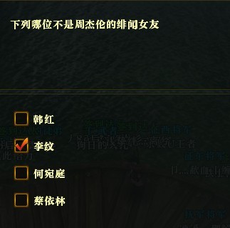 啊啊啊啊啊啊啊……看到这题我乐屎了!(我是随便选选的,反正选错了。。。) 后来才想起来,应该是韩红,韩红是许志安的绯闻女友。。。。 (PS:小编会说,我看到完全就是懵的么!这有多少人不知道啊,估计连周杰伦自己都不知道吧……不知道怎么出的题,与游戏都没关系!)