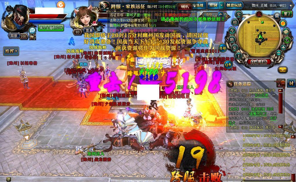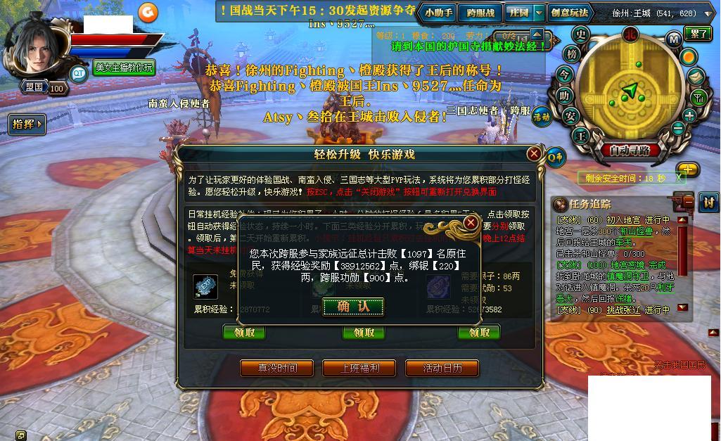 个人或几人跨服的话,可以尝试中午的时候去,那时人不多。 偷经也一样,中午的时候好偷。 运气很好,这区小号很多,杀到累,也庆幸这服的人没有什么人守国,杀跨服也就几次。