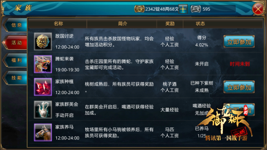 腾讯第一国战手游《御龙在天手游》已经开启点将测试,在体验测试中增加了大量新玩法和福利活动,其中家族系统是游戏的核心玩法之一。玩家们在家族里能够找到归属感,家族庄园里又有聚义厅、演武堂、牧场和农田等建筑物,同时还有大量的家族任务和福利活动,让玩家们以家族为单位一起征战天下。 加入家族征战三国 家族成为坚强后盾 《御龙在天手游》的家族系统类似于帮派、工会和军团玩法,玩家们在达到30级后,就可以自己建立或者加入家族。30级以上的玩家需要消耗银子来建立一级家族,也可以直接消耗金子来建立二级或三级家族。在家族中又有族长、副族长、长老和族员等不同职位,族长和副族长拥有任命成员、开家族活动、改家族公告、研究家族技能和招人的权力。家族是族员们最坚实的后盾,能够让玩家们在这里找到归属感,如果自己被敌对国家的敌人欺负了,在身后还有家族里的一大群兄弟们为你出头。 共同建设家族庄园 大量福利回馈族员 家族庄园是家族的驻地,在庄园里有聚义厅、演武堂、家族农田和家族牧场等建筑物,这些建筑的等级越高,家族成员们享受到的福利也越好。聚义厅的等级代表了家族的等级,升级聚义厅可提升家族人员上限,并且可以在家族商店兑换更多种类的物品。演武堂用于研究和学习家族技能,技能可以提升人物的属性。家族农田用来种植桃树,族员们在完成每日种植任务的同时,可以根据桃树等级的高低来收获不同等级的桃子酒。族员在家族牧场中可以完成“家族养马”活动,从而获得不同等级的养马礼包。 家族活动玩法丰富 尽享海量经验福利 在每日活动和家族活动都可以参加家族的任务,家族任务的种类非常多,有敌国讨逆、腾蛇来袭、家族种植、御龙源温泉、家族群英会、家族养马等日常任务。这些家族活动奖励大量经验、道具和家族工资,家族工资可以在商城购买重要道具。其中温泉洗澡和群英会喝酒,能够带来海量的经验,玩玩家们冲级必做的每日活动。参加敌国讨逆战斗,能够获得武勋,武勋也可以在商城兑换淬炼宝石等道具。只有不断通过参与家族活动和任务,才可以获得海量的经验和家族福利。 作为《御龙在天手游》游戏的核心内容之一的家族系统,这里更加看重的是家族成员之间的精诚团结。只有在家族当中做出贡献,家族才会壮大,族员也会更快的成长。 [编辑:Tya、小爱]
