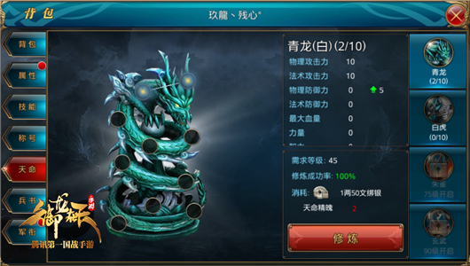 御龙很多玩家都会问同样一个问题,“为什么咱俩装备差不多,可是你战力那么高?”小编被问到这个问题时也产生了疑问,照样升级整装备,为何会变成他们口中的强力号呢?也许是因为小编更看重细节吧。接下来就让小编说说如何从细节中提升你的战斗力吧! ①战力提升之名将属性 人物装备中有一个名将属性,绿装有两条属性,而紫色更是有三条之多。 属性颜色会与装备颜色一致,即紫色增加战力最多,白色最少。 如何洗属性?那就需要名将改造符了。 名将改造符有黄、绿、紫三个等级,使用不同颜色的名将改造符都会使你装备出现或刷新与该颜色改造符相同或更高级别的名将属性。 土豪玩家可以考虑刷成全紫色加攻击或暴击名将属性,但是平民玩家怎么玩?我们就只能关注每日都可以免费获取的黄色改造符啦!每天系统都会发放两把名将之匙,名将之匙是进入名将副本的必备条件。运气好你就会轻松获得名将改造符,所以将军们请不要错过如此良机哦!小编提示名将之匙是有时间限制的,请在过期前尽快使用。 再者就是主线任务,完成相应的主线任务都获得名将改造符。前期攒着不要浪费,等咱集齐一套紫装以后再进行洗练。 那么除了以上两点还有什么方法能获得名将改造的途径吗? 当然,每日两次的斩龙脉也会赠送将军改造符,以及活跃度奖励中也会赠送。所以只要积极参与活动,想要拥有一身全黄属性名将装备那都不是梦,运气好还会刷出绿色和紫色名将属性哦! ②战力提升之砸星 御龙砸星等级为1-18星,成功砸到6、9、12、15、18都会激活相应的称号,能大大提升战力哦! 砸星一要财力二要技术,很多玩家都会抱怨砸星很坑,但是有几点各位将军都需要注意: 一,时间地点。砸星肯定要选择人少的时候,尽量寻找荒无人烟的地方砸星,想必大家也都能关注到很多玩家会选择凌晨或者清早砸星; 二,装备砸星多次失败怎么办?很多玩家急于求成,看见装备多次失败掉星就一怒之下使劲怼,这是一个大误区。如果一件装备连续五次都没上那就换件装备或者换个时间,不然可真的是赔了夫人又折兵。 那如何砸星才能事半功倍呢? 完成每日任务以及各类主线、支线都会赠送大量淬炼星石,切记不要有多少就砸多少,尽可能等攒到一定程度一起去砸,大多数玩家都可以在70破封的时候达到一套6星。 除了直接赠送的晶石,系统也会赠送金券,金券可以在商城兑换淬炼石。当然还能通过寄售行购买,所以获得淬炼石的途径多种多样。 ③战力提升之天命 天命分青龙、白虎、玄武、朱雀四个神兽,每当你到达相应等级就可以激活一个神兽,通过天命副本可以不断提升神兽等级,每个神兽上限是【紫色10/10】。 天命的成长需要慢慢累积,玩家每天可以重置进度,挑战过得可以直接自动挑战,更贴心的是即便离线时间也还是在计算中,这大大减少了等待时间。 天命颜色的深浅也是决定了能否成为强力号的基础之一。 [编辑:Tya、小爱]