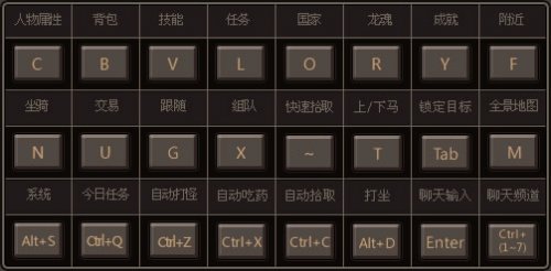 快捷键功能 1. 快捷键说明: 通过键盘按键直接进入相关功能界面。 2. 快捷键大致介绍: 3. 各快捷键详细介绍: (1)人物装备、属性界面(快捷键C):点击打开人物属性面板,角色的所有相关属性、装备、抗性、成就值、阵营、官职等都可以在该面板得到展示; (2)包裹界面(快捷键B):点击打开包裹,查看自己身上所携带物品、战魂等; (3)技能界面(快捷键V):点击打开战斗技能面板,查看角色所学习的技能状态,并可以查阅相关技能书掉落地点; (4)任务界面(快捷键L):查看你的当前任务以及未接任务; (5)国家(快捷键O):打开国家界面,查询国家情况; (6)龙魂(快捷键R):点击打开龙魂面板,查询当前所获得的战魂点数以及操作进行武器炼化; (7)成就(快捷键Y):点击打开查看当前所获得的成就项目以及可完成的成就项目及其成就点数情况; (8)附近(快捷键F):可以查看角色附近片区内的怪物、NPC以及玩家的信息,双击对应目标可自动寻路找到目标身边; (9)坐骑(快捷键N):可以查看当前拥有的坐骑的装备、属性情况,可以操作选择上下骂以及将坐骑跟随人物或放生; (10)交易(快捷键U): 打开可以选择同其他玩家进行交易相关操作; (11)跟随(快捷键G):可以开启跟随某位玩家的功能; (12)组队(快捷键X):打开可以进行队伍的相关操作,招募队员或加入别人队伍; (13)快速拾取(快捷键 ~):可以快速拾取地上的宝箱; (14)上/下马(快捷键 T):小马20级以前,T键可以开启小马跟随/隐藏状态;当小马成长到20级后,可以用T键自动上马和下马; (15)锁定目标(快捷键 Tab):选择锁定最近的敌对目标; (16)全景地图(快捷键M):打开全景地图可以查看到当前地图的整体情况; (17)系统(快捷键Alt+S):打开可以进行游戏画面、音频、快捷键等系统相关内容的设置,也可选择退出游戏; (18)今日任务(快捷键Ctrl+Q):查看角色今日可以参加的任务、活动以及国战等信息; (19)自动打怪(快捷键Ctrl+Z):可以在指定范围内进行自动打怪,点击小地图边上的"挂"字按钮可以进行自动打怪的相关设置; (20)自动吃药(快捷键 Ctrl+X):自动消耗包裹里的药品,补充HP和MP; (21)自动拾取 (快捷键Ctrl+C):自动拾取怪物掉落的物品; (22)打坐(快捷键 Alt+D):可以坐下,每间隔一段时间恢复人物一定量的HP和MP; (23)聊天输入(快捷键 Enter):可以打开聊天文字输入窗口; (24)聊天频道(快捷键 Crtl+[1~7]):聊天频道切换,1~7分别对应:附近、区域、州郡、世界、队伍、家族、帮会;也可以使用"/频道拼音缩写"或"/频道中文名称"切换聊天频道。如:在区域频道中发言,可以使用"Ctrl+2"、"/区域"或者"/qy"切换至区域频道。 [编辑:阿常]