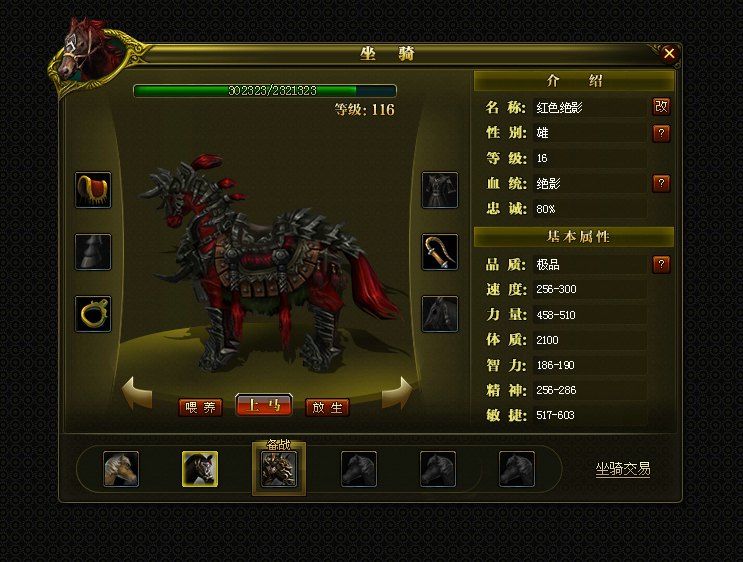 当你出生于美丽的桃源村,将会接受小双MM的指引,完成系列任务后,会得到第一匹小马——萌萌。而在以后的成长生涯中,通过收获马牌的方式,也可以得到更多优良血统的坐骑。 小马的成长有三个阶段,第一个阶段是小马驹(1-19级),第二个阶段是可骑乘的坐骑(20-30级),第三个阶段是可在坐骑上参与战斗的战骑(30级以上)。 马匹养成: 第一阶段小马驹通过主线任务获得,使用快捷键T可以切换小马驹的跟随状态和隐藏状态。获得小马驹后,以下两种方式可以让马匹获得经验,提升马匹等级: 1、主人杀怪时,马匹可以获得怪物一定比例的经验. 2、通过打怪掉落或者参加各种活动获取坐骑经验丹,使用坐骑经验丹可以提升大量的马匹经验。 当小马驹成长至20级后,玩家将自动乘坐坐骑,此时使用快捷键T可以切换坐骑的乘坐状态和隐藏状态。骑乘后移动速度将大幅提升,此时玩家在坐骑上还不能参与战斗,进入战斗状态时将自动下马。 坐骑30级时成长为战骑,此后玩家在骑乘在坐骑上也可以参与战斗,使用快捷键T可以切换坐骑的乘坐状态和隐藏状态。同时坐骑成为战骑后还可以装备坐骑装备。 个性坐骑: 你可以给自己的战骑(30级以上)装上高品质的马鞍、马蹬、马铠、马蹄,再配上合手的马鞭,战骑的属性也会相应得到提升,让你驰骋沙场,如虎添翼。 [编辑:阿常]