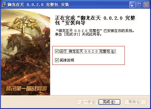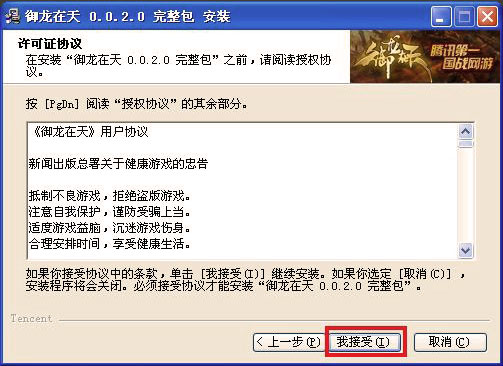 2、双击客户端安装程序,等待数据加载完毕,点击【下一步】运行安装程序; 3、仔细阅读许可协议,接受后点击【我接受】继续安装 4、设置《御龙在天》安装路径,注意您当前可用空间的大小,点击【安装】继续 5、安装过程可能需要一段时间,请您耐心等待 6、完成客户端安装,您可勾选直接进入游戏,或打开用户协议
