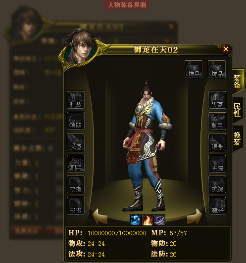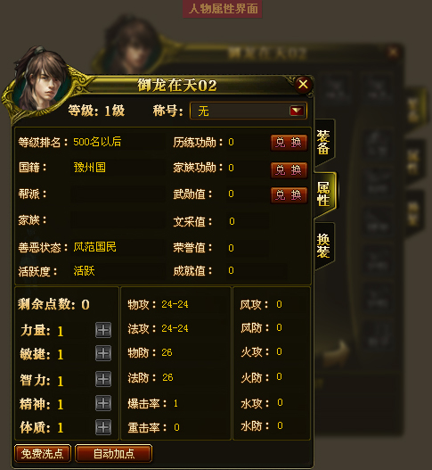 在《御龙在天》创建角色时,玩家只需选择角色的性别、初始形象、头像即可创建一个人物,所创建的角色最初没有职业之分的。至于选择什么职业,全看玩家学习的技能(技能配点)。 而根据所选择的职业,玩家也可以自由配置属性点,或者选择自动加点。 人物属性点具有5个可自由配点的人物属性: 力量------提高物理攻击力 敏捷------提高物理防御力,同时也提高少量的魔法防御力 智力------提高法术攻击力和MP上限 精神------提高魔法防御力,同时也提高少量的物理防御力 体质------提高HP上限,同时也提高少量的MP上限 每个装备位可穿上一件对应对位的装备,用于提高人物的属性,同时不同的装备位,增加的属性也有所区别。