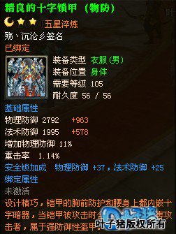 105级物防衣服,重金属的感觉,这等级男人就该穿这样的,霸气,装备描述身上有装暗器,这倒没看出来。